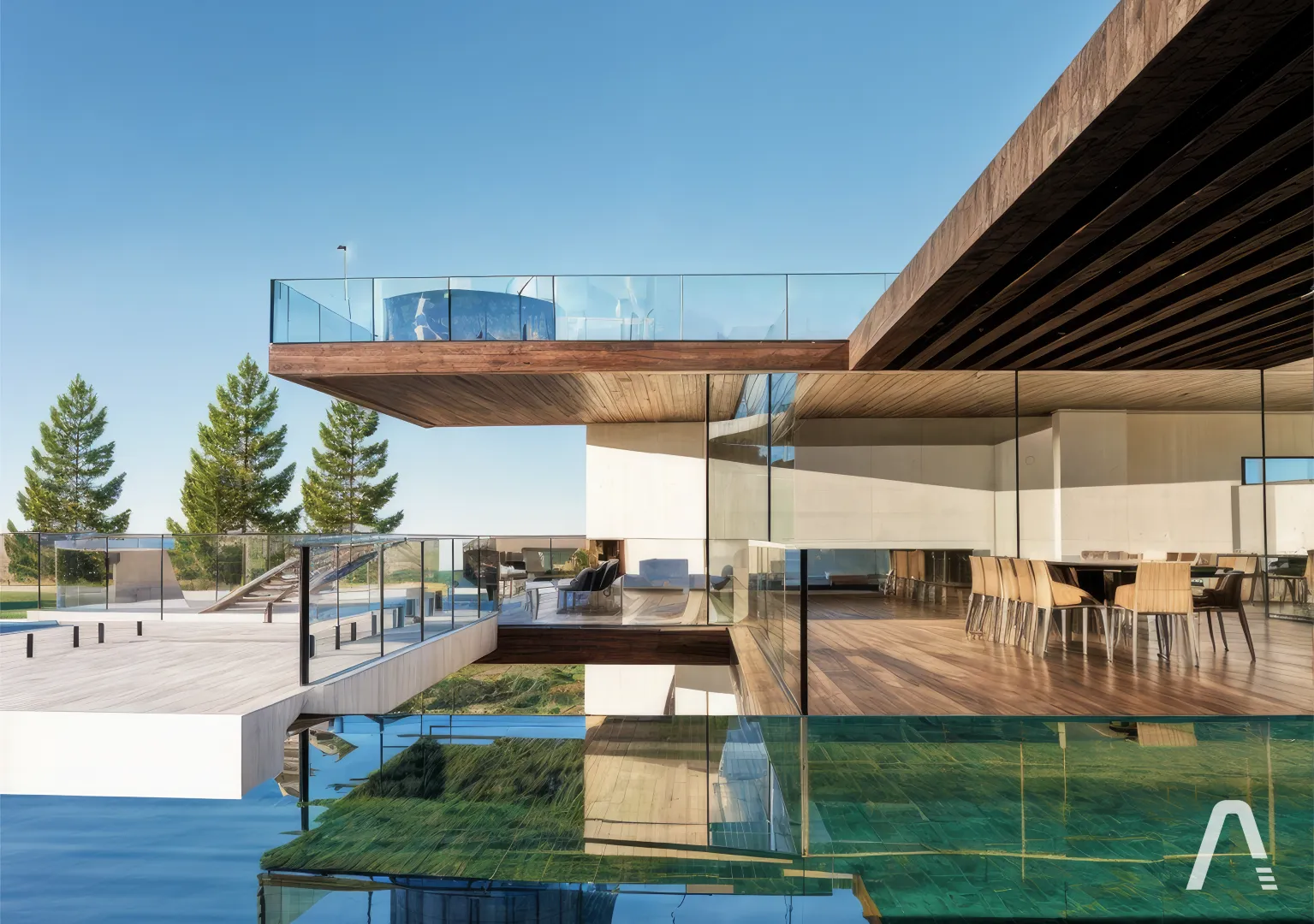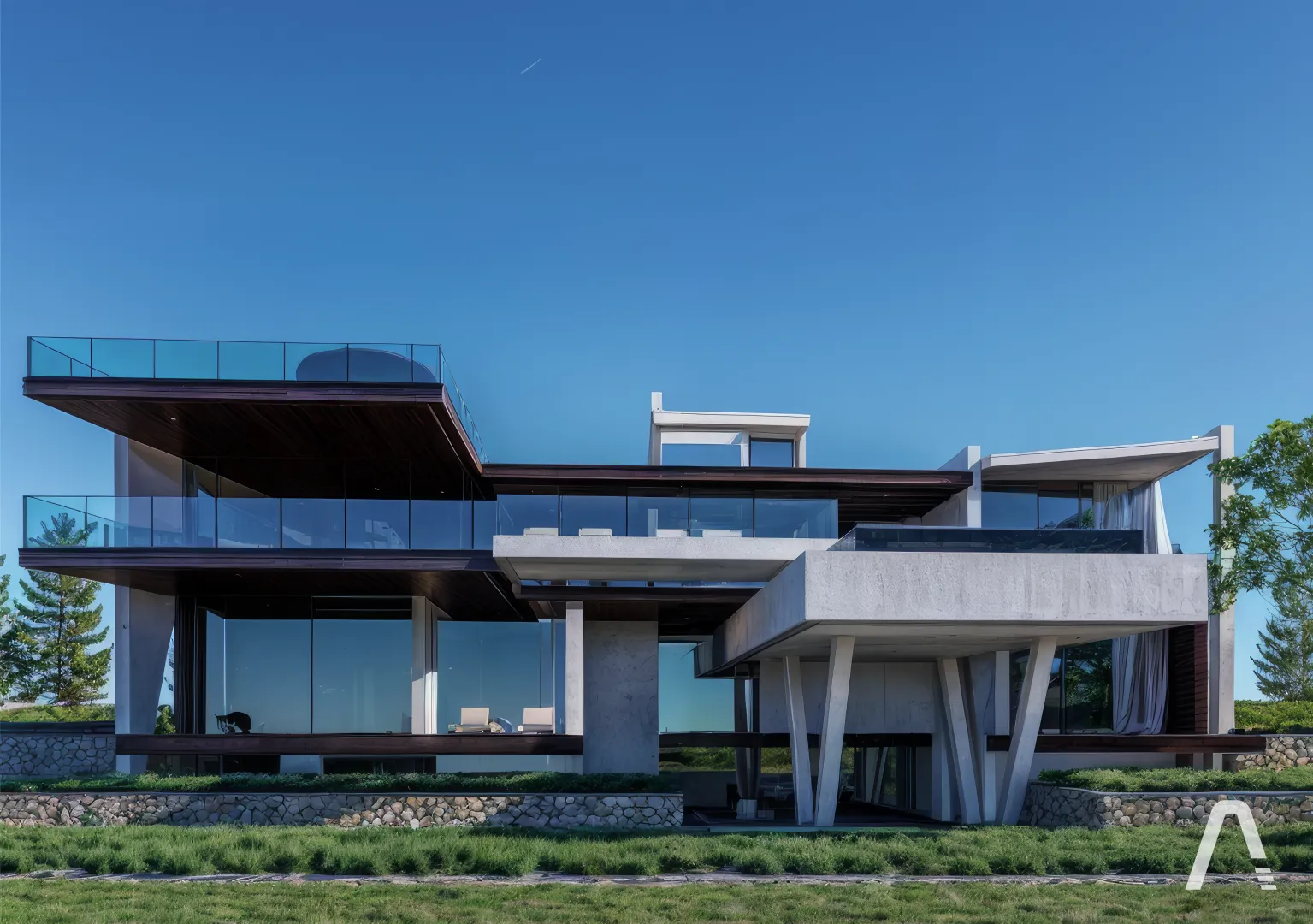 Sustentabilidade é um ponto forte, com grandes aberturas de vidro e terraços verdes que promovem eficiência energética. O layout valoriza áreas de lazer amplas, com estruturas em balanço e garagem funcional. O paisagismo complementa o projeto com gramados, arbustos e árvores estrategicamente posicionadas, criando harmonia entre natureza e arquitetura.
