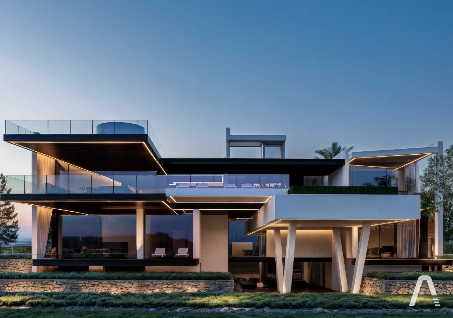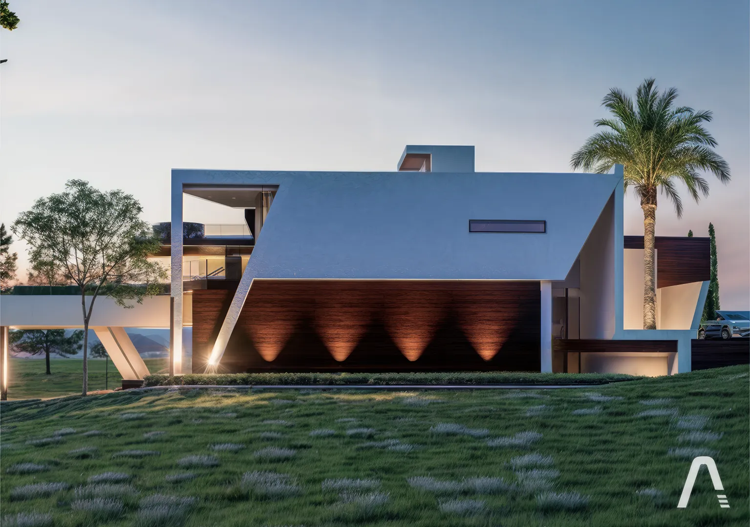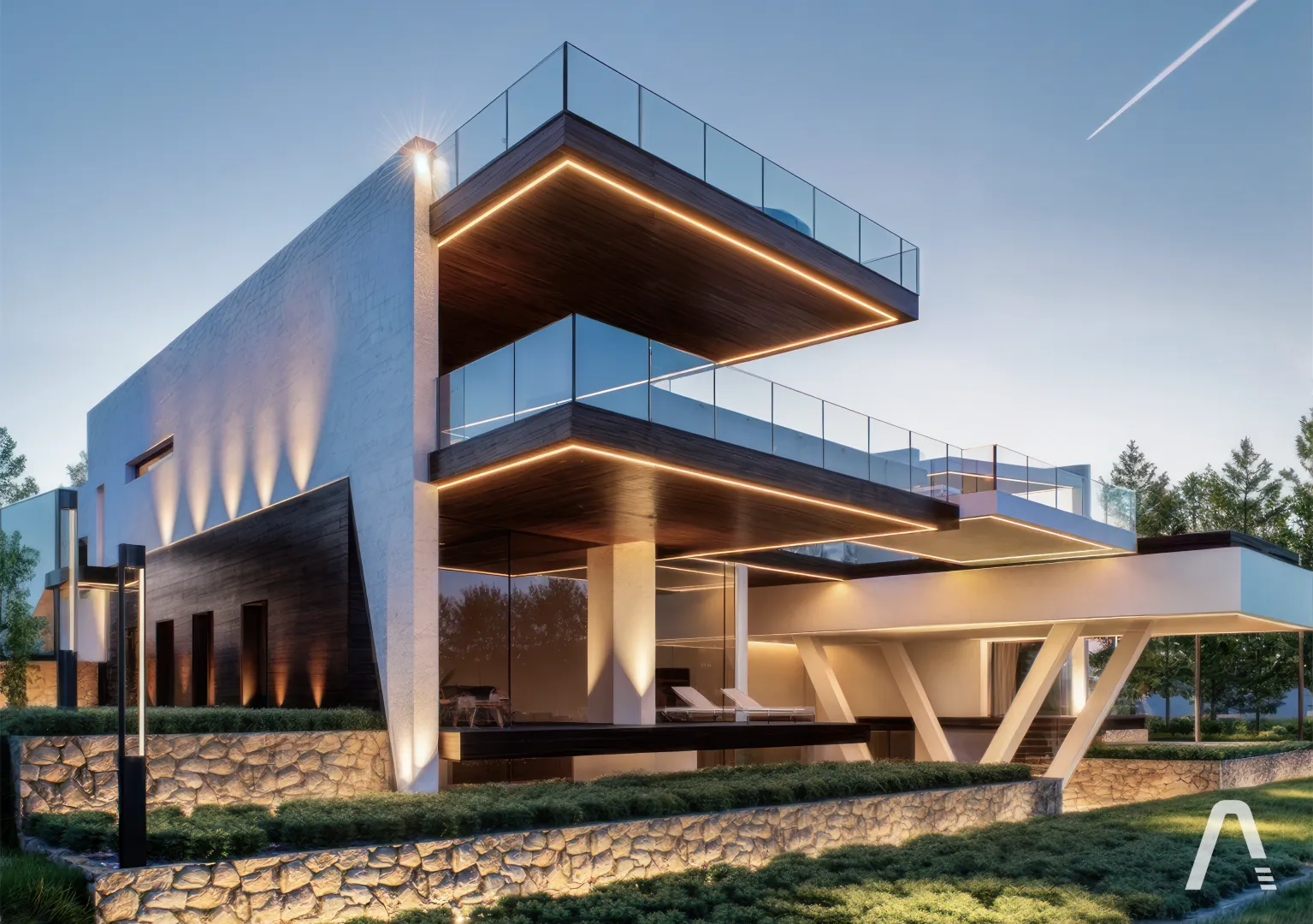 Projeto residencial combina design moderno com integração ao ambiente externo. Destaca-se por suas linhas retas e formas geométricas sofisticadas, utilizando materiais como concreto branco, madeira escura e pedra natural. A iluminação externa realça a volumetria e texturas da casa.