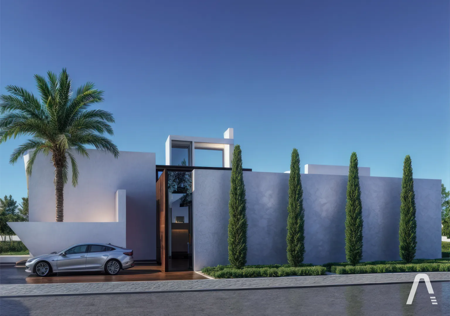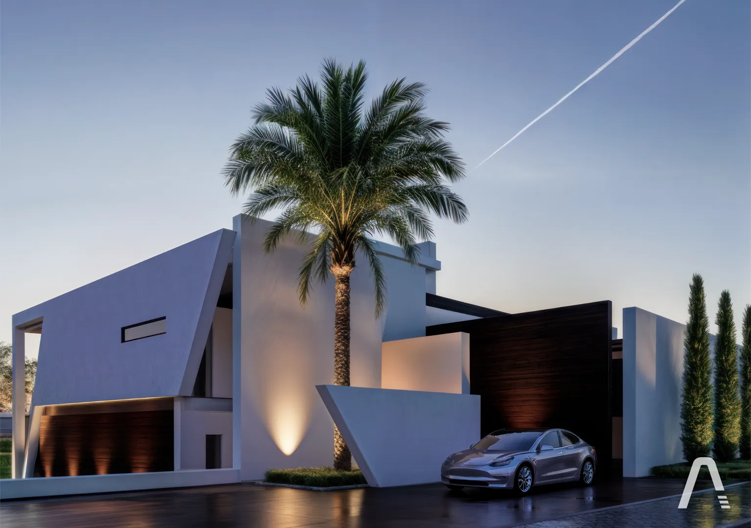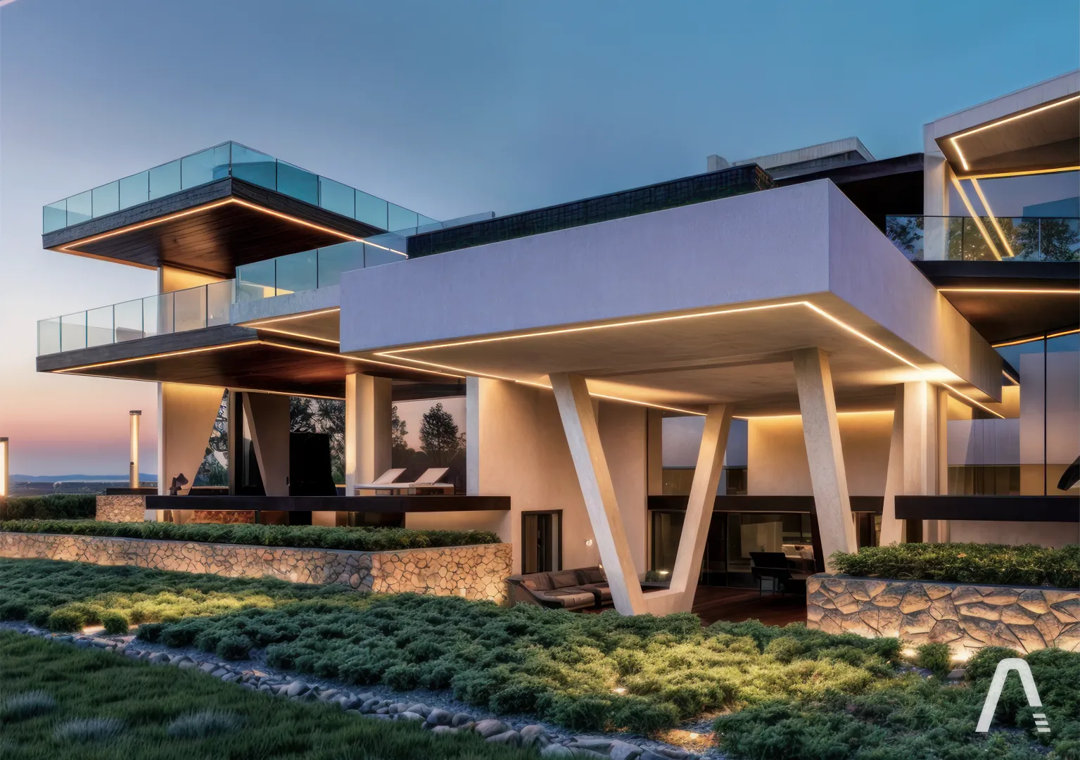 Projeto residencial combina design moderno com integração ao ambiente externo. Destaca-se por suas linhas retas e formas geométricas sofisticadas, utilizando materiais como concreto branco, madeira escura e pedra natural. A iluminação externa realça a volumetria e texturas da casa.